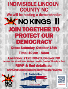 Join Indivisible Lincoln County NC for a Protest for No Kings II When 10/18/2025 10:00 am - 12:00 pm Add To Calendar Download ICS Google Calendar iCalendar Office 365 Outlook Live Event Type Community Event https://www.mobilize.us/commoncause/event/848216/