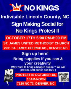 | Join Indivisible Lincoln County NC for a Sign Making Social at St. James United Methodist Church! 6pm-8pm. Bring supplies if you have them, but we will have extra. Also, may want to bring a bag supper, we’ll have some soft drinks! Let’s get Creative! Sign up is appreciated. |
